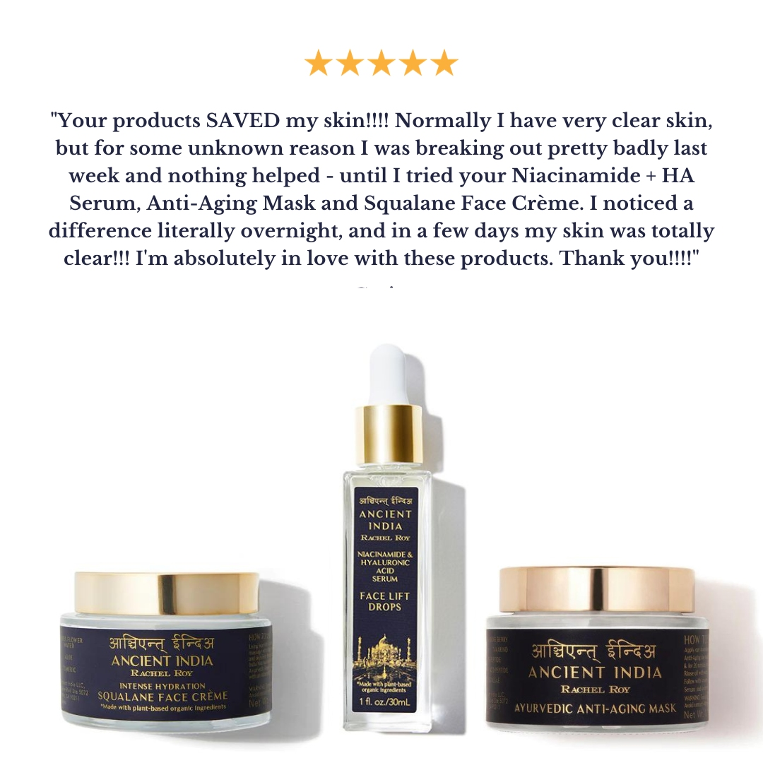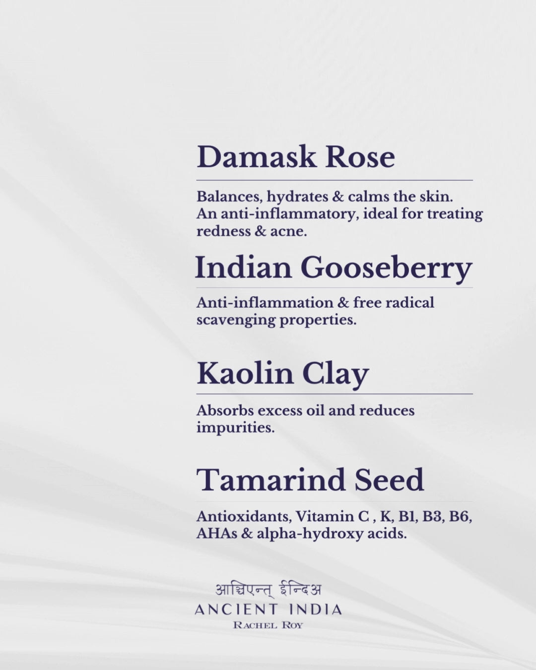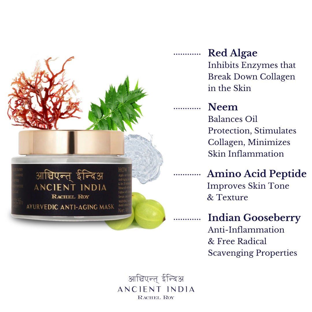 Water (Aqua), Kaolin (Clay), Bentonite (Clay), Rosa Damascena (Damask Rose) Flower Extract*, Glycerin* (Softens Skin), Propanediol (Moisture), Xanthan Gum (Natural Binding), Phyllanthus Emblica (Indian GooseBerry) Fruit Extract*, Brassica Alba (Mustard) Seed Extract, Pisum Sativum (Pea) Extract, Aloe Barbadensis Leaf Juice*, Ahnfeltiopsis Concinna (Red Algae) Extract, Sodium Hyaluronate (Hyaluronic Hydrating), Tamarindus Indica (Tamarind) Seed Polysaccharide, Sodium PCA (Hydrating), Camellia Sinensis Leaf (GreenTea) Extract, Acetyl Tetrapeptide-2 (Amino Acid Peptide), Lactic Acid (Exfoliating Alpha-Hydroxy), Caprylyl Glycol (Humectant), Lavandula Angustifolia (Lavender) Oil*, Cymbopogon Flexuosus (Lemongrass) Oil, Curcuma Longa (Turmeric) Root Extract, Melia Azadirachta (Neem) Leaf Extract, Tetrasodium Glutamate Diacetate (Stabilizer), Simmondsia Chinensis (Jojoba) Seed Oil*, Phenoxyethanol (Maintain PH Levels), Ethylhexylglycerin (Skin Softening Agent), Leuconostoc (Radish) Root Ferment Filtrate*Denotes organically produced ingredientWARNING - For external use only. Avoid contact with eyes.