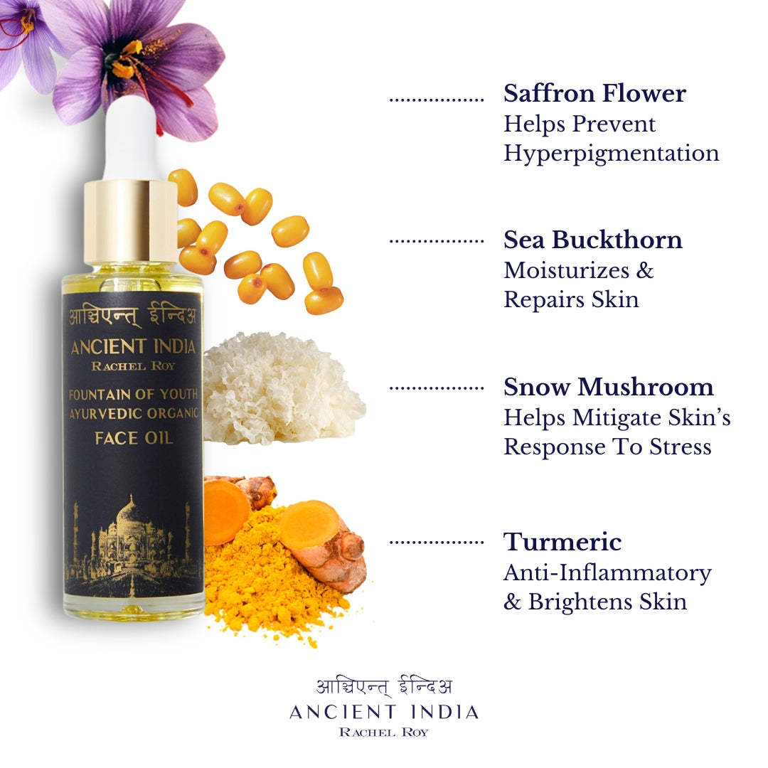 Helianthus Annuus (Sunflower) Seed Oil*, Simmondsia Chinensis (Jojoba) Seed Oil*, Sodium Hyaluronate, Hippophae Rhamnoides (Sea Buckthorn) Oil*, Psoralea corylifolia (Babchi) Seed Extract*, Zingiber Officinale Roscoe (Ginger Root) Extract*, Triphala (Emblica Officinalis /Terminalia Chebula / Terminalia Belerica) Extract*, Tremella Fuciformis Extract*, CrocusSativus (Saffron) Flower Extract* Curcuma Longa (Turmeric) Root Extract*