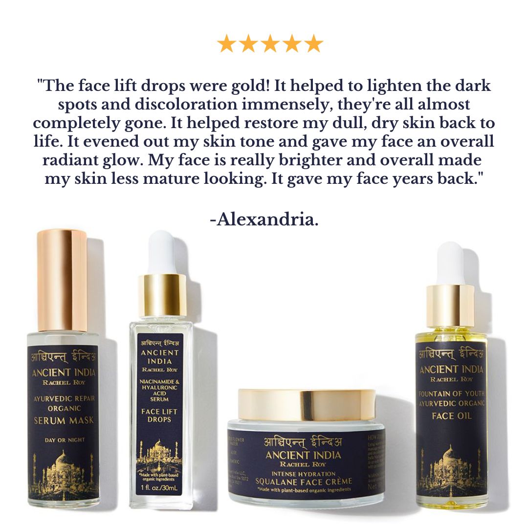 Helianthus Annuus (Sunflower) Seed Oil*, Simmondsia Chinensis (Jojoba) Seed Oil*, Sodium Hyaluronate, Hippophae Rhamnoides (Sea Buckthorn) Oil*, Psoralea corylifolia (Babchi) Seed Extract*, Zingiber Officinale Roscoe (Ginger Root) Extract*, Triphala (Emblica Officinalis /Terminalia Chebula / Terminalia Belerica) Extract*, Tremella Fuciformis Extract*, CrocusSativus (Saffron) Flower Extract* Curcuma Longa (Turmeric) Root Extract*