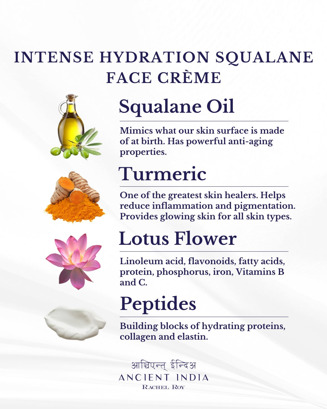 With the warmth of your own energy, use your fingertips to gently massage your squalane face moisturizer onto your face and décolleté twice daily. Apply alone or after Ancient India Niacinamide & Hyaluronic Acid Serum or Ayurvedic Repair Serum Mask. Follow with a mineral-based SPF sunscreen during the day.
